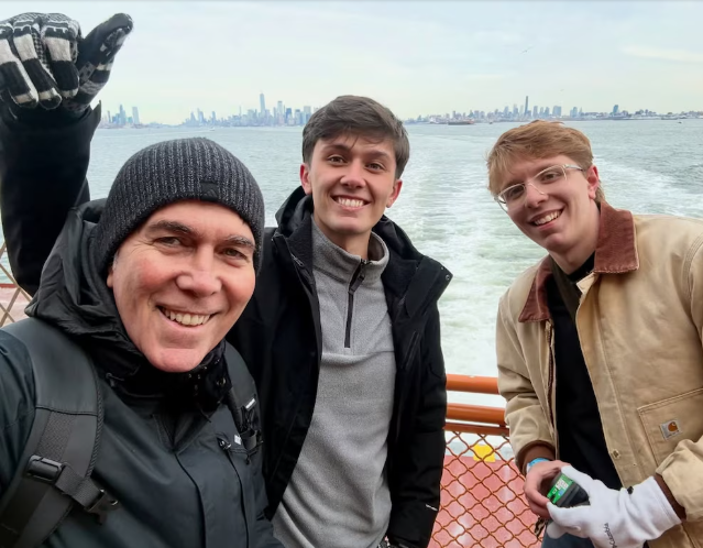 Otra postal los encuentra frente al famoso Charging Bull de Wall Street, rodeados de turistas, pero con la alegría intacta. En una tercera imagen, a bordo de un ferry, se los ve señalando el horizonte de Manhattan, como si contemplaran un sueño hecho realidad. El toque argentino aparece en otra de las fotos, donde los tres exhiben con orgullo una bandera de San Lorenzo en plena Nueva York, acompañada por un guiño cultural con un cartel dedicado a Charly García.