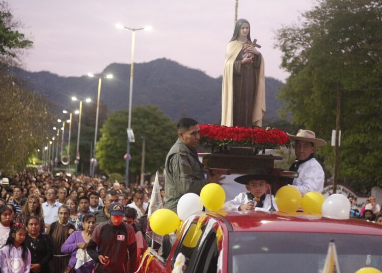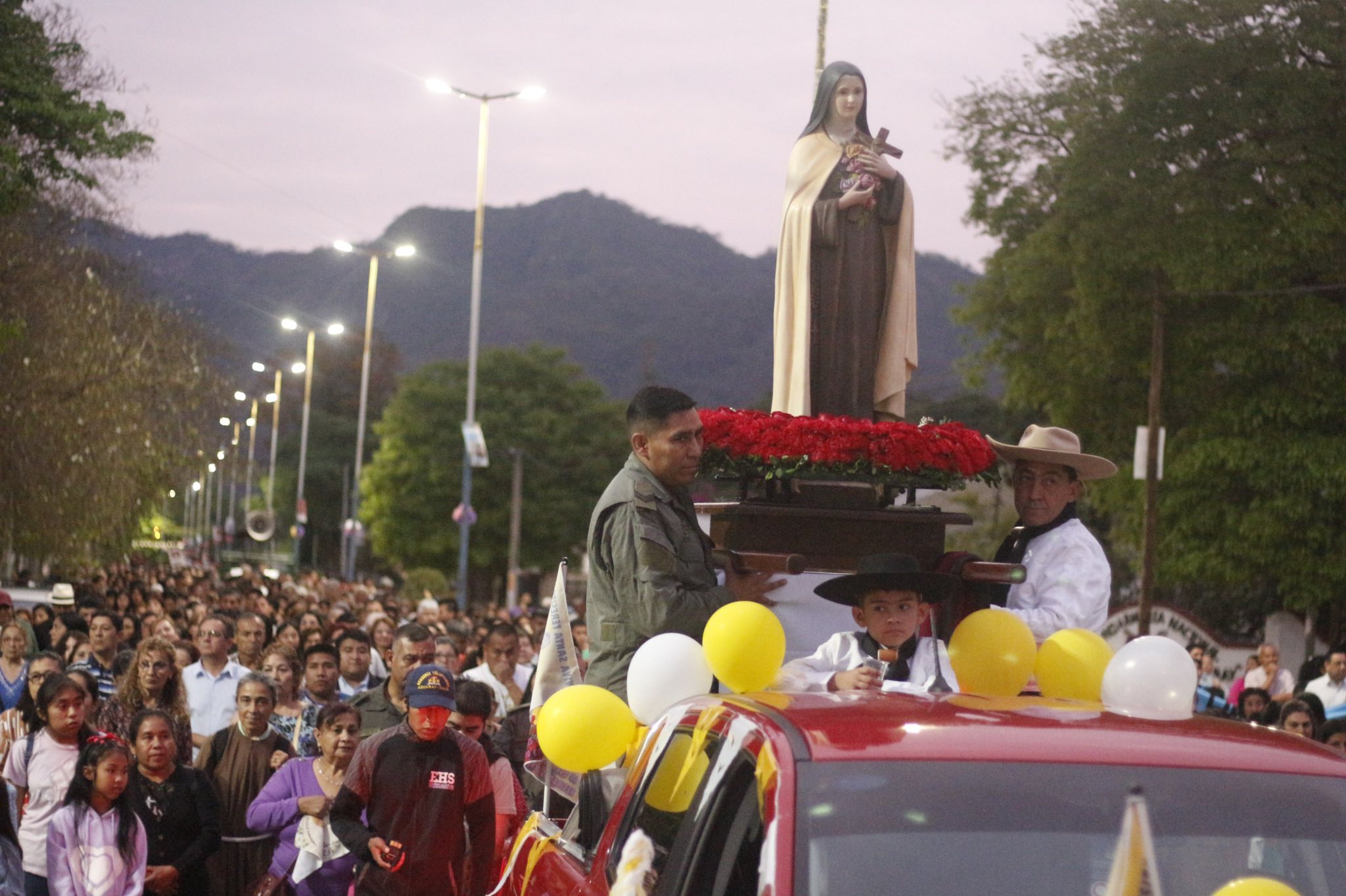 La celebración dio inicio con la procesión solemne, en la que la imagen de Santa Teresita fue llevada por los fieles en un recorrido cargado de emoción, cantos y plegarias. A lo largo del trayecto, los vecinos acompañaron con flores, pañuelos y oraciones, en un gesto de agradecimiento y súplica a la santa, conocida por su humildad, entrega y confianza plena en Dios.