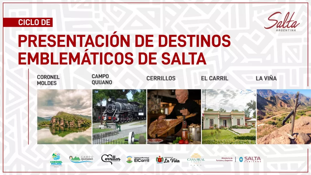 Este viernes 28 de noviembre, a las 11, se realizará en el Hotel Casa Real una nueva edición de las presentaciones de destinos salteños. En esta oportunidad, Coronel Moldes, Campo Quijano, Cerrillos, El Carril y La Viña compartirán sus propuestas turísticas ante prestadores, operadores y medios de prensa.