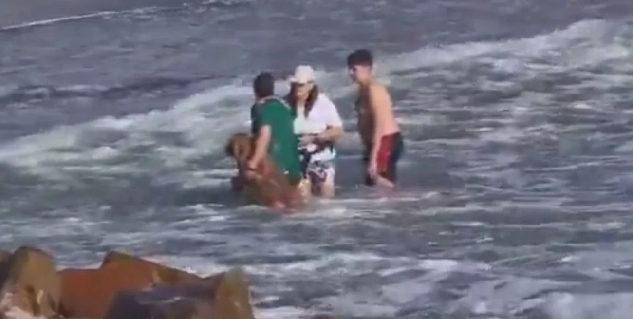 En la grabación se ve al animal luchando por mantenerse a flote, mientras su familia lo llamaba desesperadamente desde la playa. Un vecino, al percatarse de la situación, no dudó en intervenir: completamente vestido con pantalón largo y remera, nadó hasta alcanzar al perro, lo abrazó y lo llevó sano y salvo a la orilla, donde se reunió con su familia.