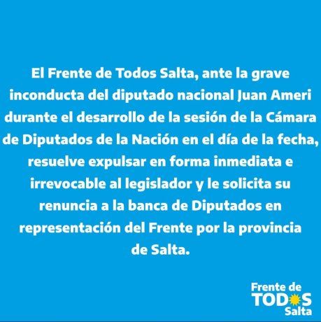 «El Frente de Todos Salta, ante la grave inconducta del diputado nacional Juan Ameri durante el desarrollo de la sesión de la Cámara de Diputados de la Nación en el día de la fecha, resuelve expulsar en forma inmediata e irrevocable al legislador y le solicita su renuncia a la banca de Diputados en representación del Frente por la provincia de Salta», sostuvo la alianza oficialista en un breve documento.