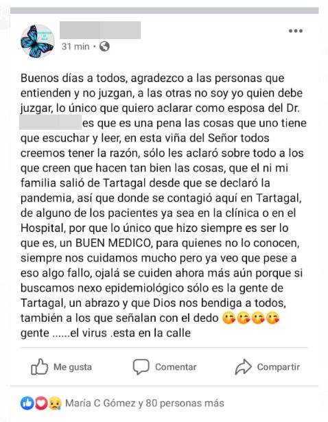 La esposa del caso positivo se expresó en las redes: «Ni él ni mi familia salió de Tartagal desde que se declaró la pandemia»