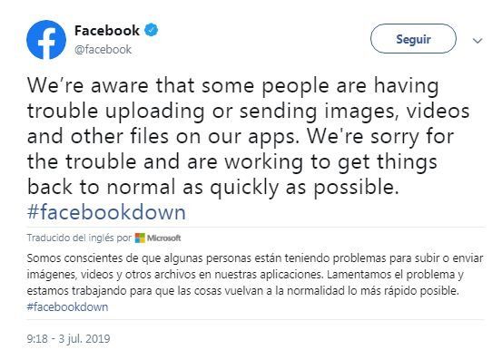 «Estamos trabajando para que las cosas vuelvan a la normalidad lo más rápido posible y nos disculpamos por cualquier inconveniente», añadió en medio de la ola de quejas que generó el inconveniente a los usuarios de esas redes de comunicación por internet.